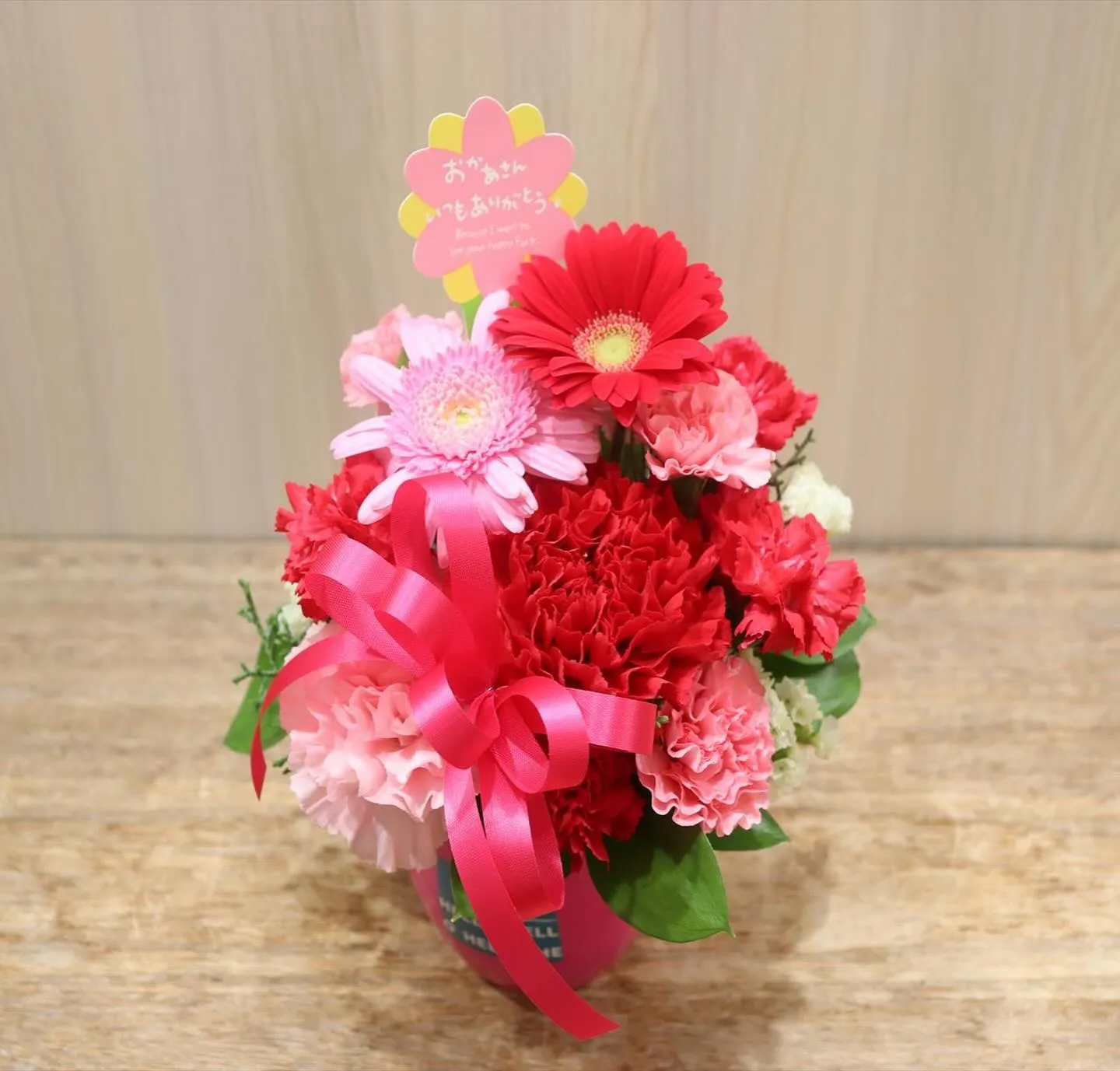 母の日のアレンジ商品のご案内です✨先日掲載したチラシの商品を細かくご紹介していきます😉本日ご紹介させていただくのはアレンジEの3,000円(税抜)のお花です💐カラフルなお花をコンパクトに可愛く仕上げて…