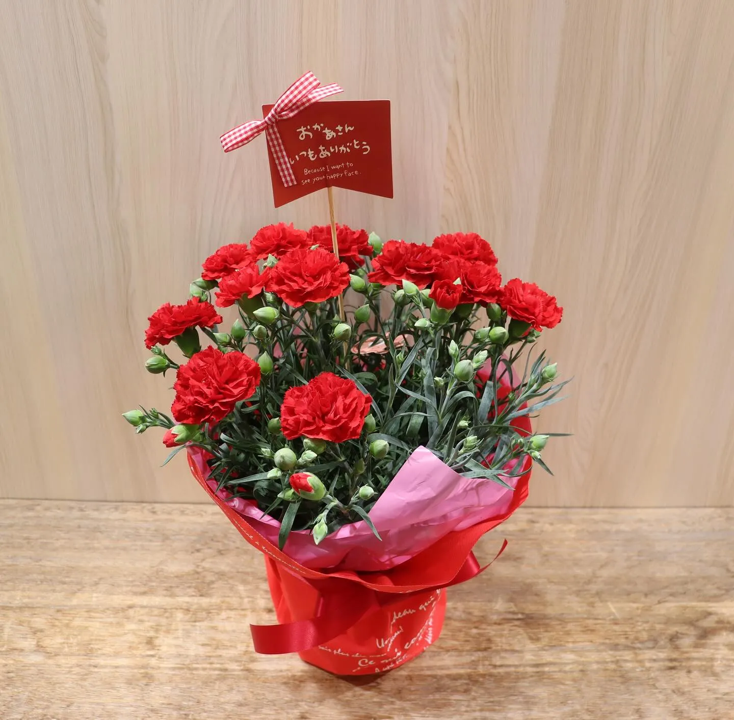 2024.5.12母の日 フラワーショップ花のんではカーネーション1輪(250円税抜)からご購入いただけます 可愛いラッピングとメッセージカードをご用意しております お手伝いをして一生懸命貯めたお小遣いで…